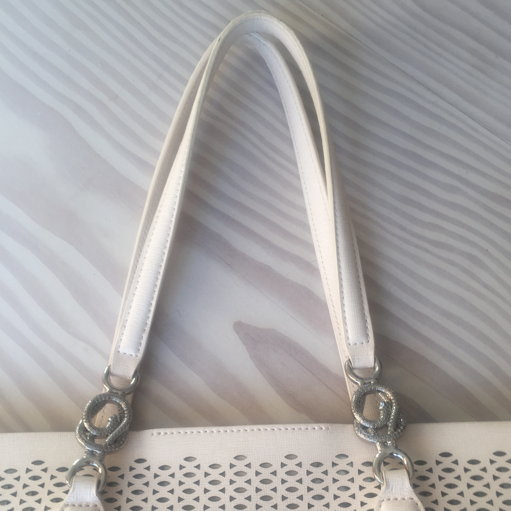 Die Tasche besteht aus echtem Leder und/oder einer Mischung aus Kalbsleder und PVC/Kunstleder, wie es für einige Cavalli Class Produkte typisch ist. Das perforierte Muster ist ein charakteristisches Designmerkmal. Es handelt sich um eine Umhänge- oder Schultertasche mit dem "Cavalli Class" Logo als Jacquard- oder perforiertem Muster. Sie hat silberfarbene Beschläge und eine Innentasche mit Reißverschluss.
